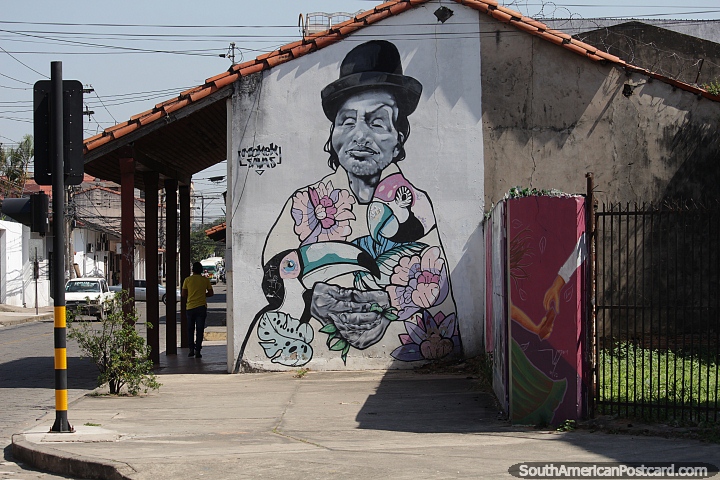 Hat lady with birds, an urban piece of street art in Santa Cruz. Bolivia
