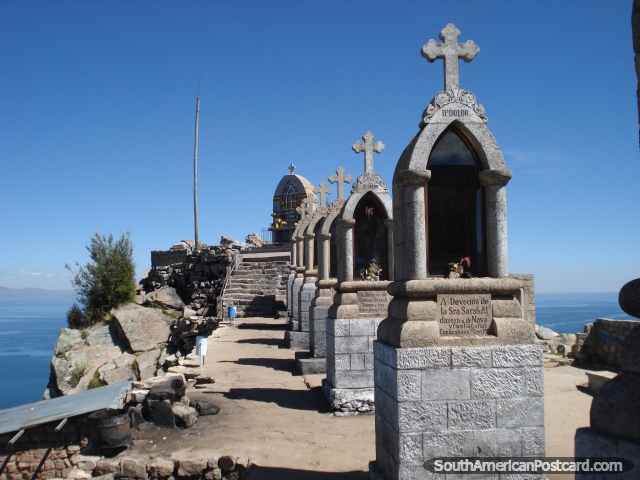 The row of shrines and crosses at the top of Cerro Calvario in Copacabana. Bolivia