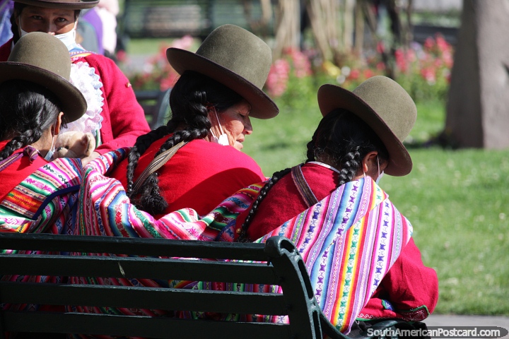 Indigenous women with brown hats and red jerseys sit at the plaza in Cusco. Peru
