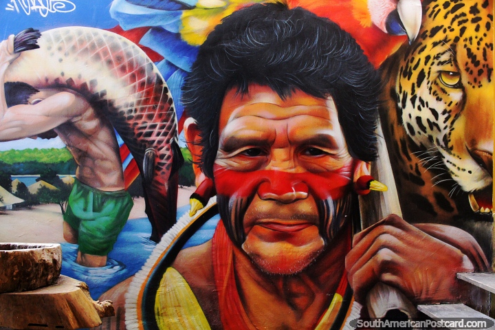 Man of the jungle with face paint, tiger and fish, mural in Alter do Chao. Brazil