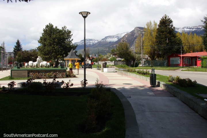 Plaza del Pionero at the start of Paseo Baquedano in Coyhaique, an area with monuments and a kids playground. Chile, South America. (720x480px). Plaza del Pionero at the start of Paseo Baquedano in Coyhaique, an area with monuments and a kids playground. Chile (720x480px), Photo: © Mark Berman