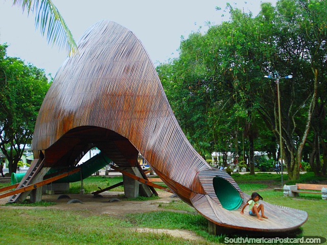 Una niña se desliza hacia abajo el patio del dinosaurio enorme en Santander Parque, Leticia. Colombia, Sudamerica. (640x480px). Una niña se desliza hacia abajo el patio del dinosaurio enorme en Santander Parque, Leticia. Colombia (640x480px), Foto: © Mark Berman