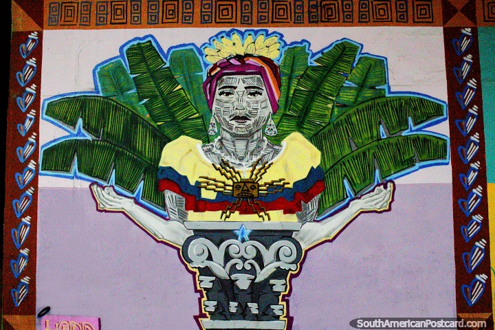 Mujer frente a una palmera que llevaba un Dios de Sol en su pecho, arte callejero en Machala. Ecuador