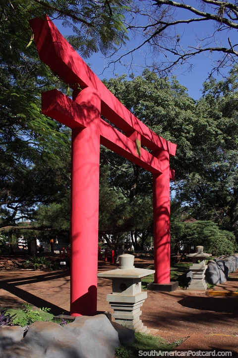 Red gate to the Japanese gardens at the Plaza de Armas in Encarnacion. Paraguay
